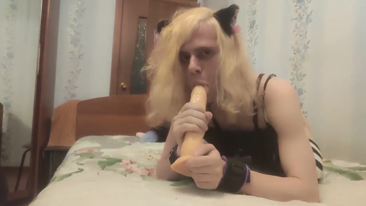 Cute Russian TS girl is a Shy boy inserting a dildo insertions and cum