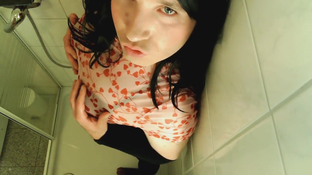 pinkish she-creature sissy rail good-sized big black cock faux-cock on mirror siss...