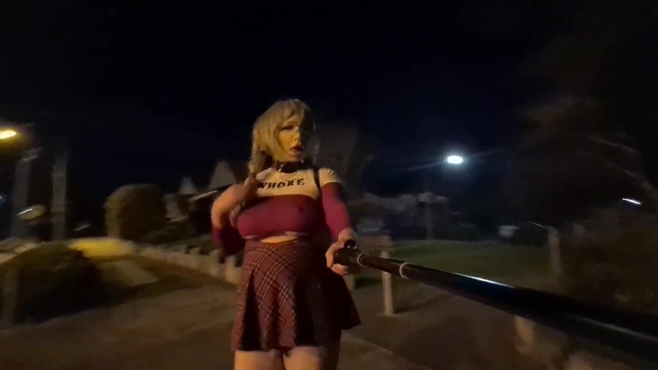 Me in a cheerleader whore uniform flashing my little cock and big fake tits on a busy night in Sydney. I was seen repeatedly! Someone's going to have to stop and fuck me sooner or later