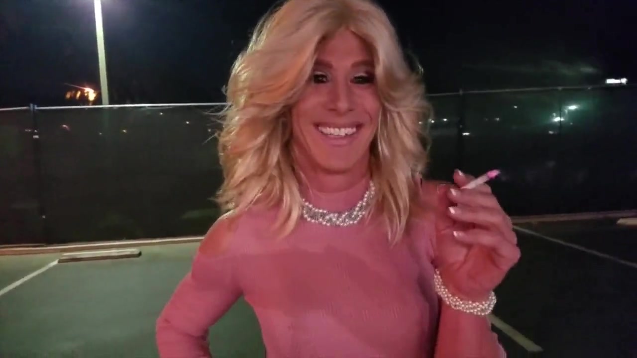 Crossdresser smokes cigarettes in public parking lot. CD trans girl smoking Virginia Slims 120s in public. Trans smoking virgina slims 120s cigarettes while wearing stocking, high heels and mini skirt