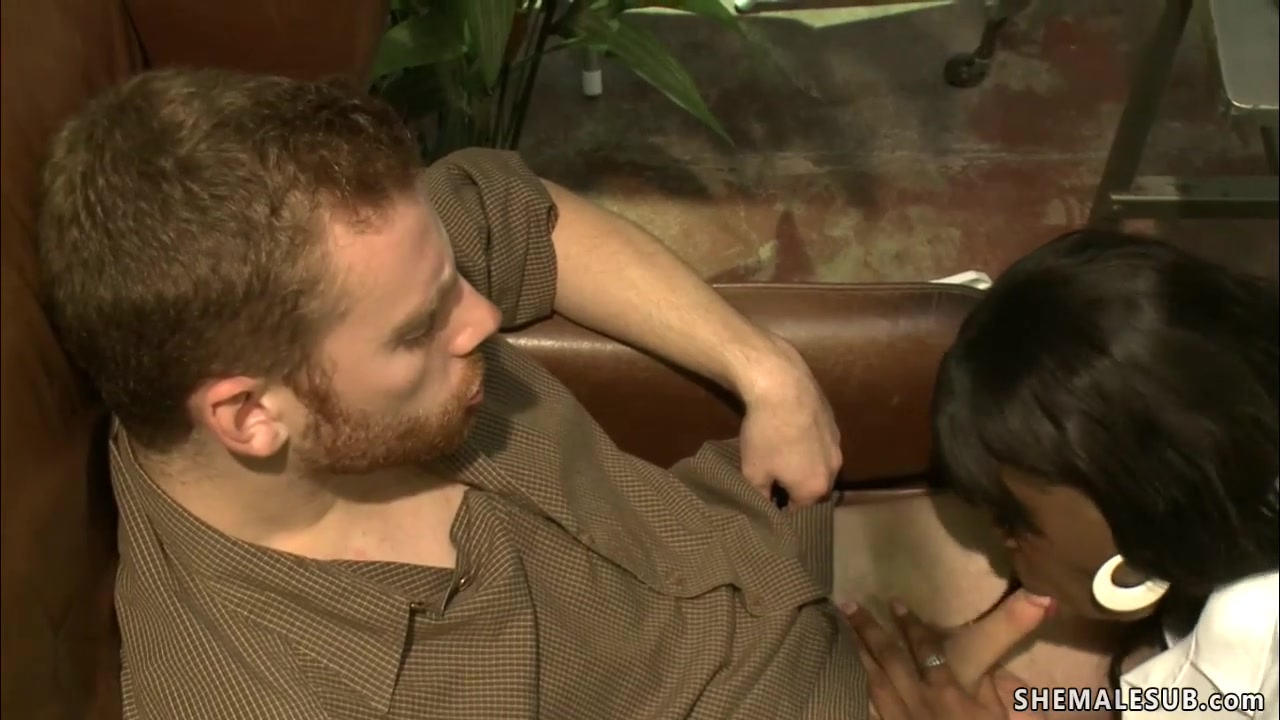 Big tits ebony shemale doctor Bambi Prescott sucks cock to white patient Sebastian Keys then with big black cock anal fucks him in armchair till cums on his face covered with money