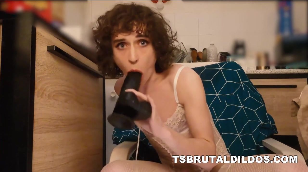 Parisian transgender hung hard takes a huge black brutal dildo deep in her asshole to a cumshot