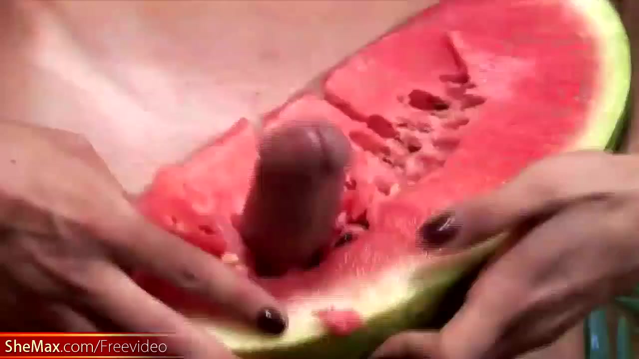 T-lady masturbates and tears up her massive shecock in a watermelon
