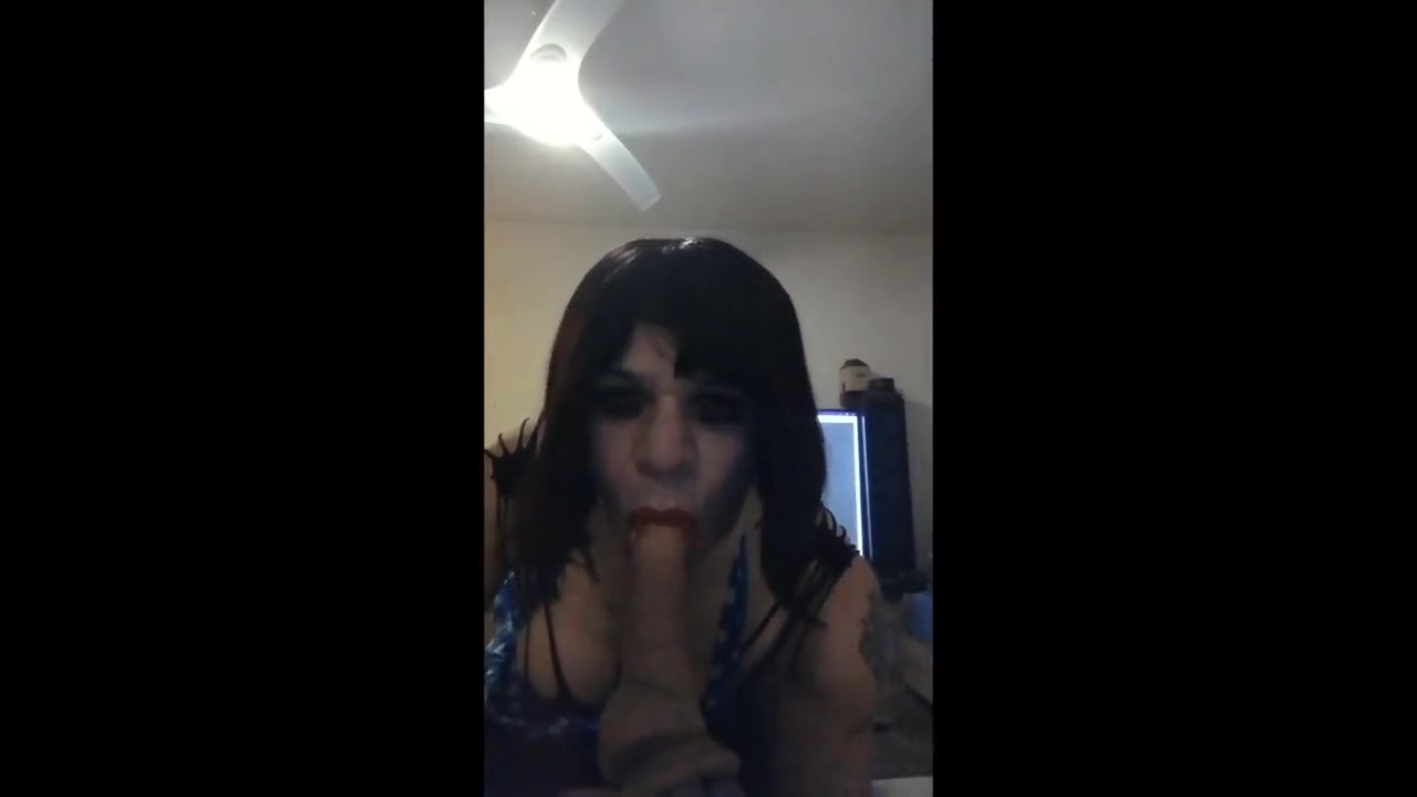 Une trans soumise en cell de chasteté se fait pénétrer avec un gode vibrant !