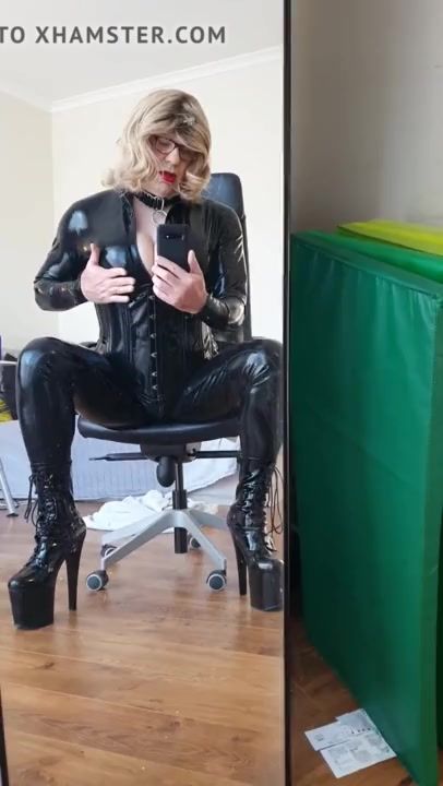 Rachel Sits in a Spandex Catsuit and vinyl Harness