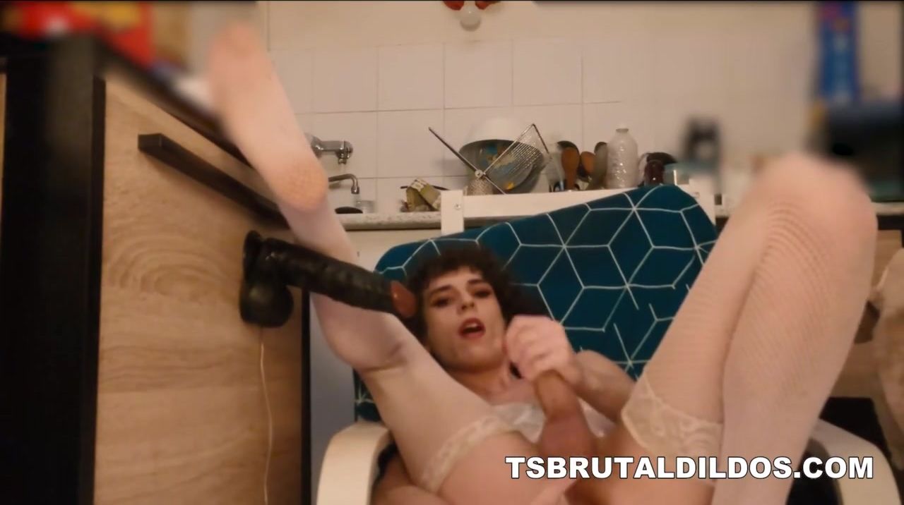 Super-Sexy Brazilian Tgirl Pinkish Pinheiro Shovels a Thick Faux-Cock in Her Butt