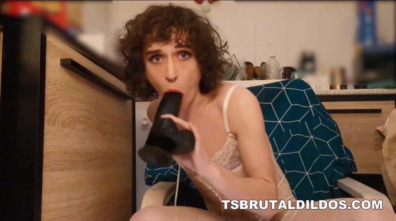 Youthful french trans with a thick lollipop bj's and screws her butt with a giant faux-cock until she spunks