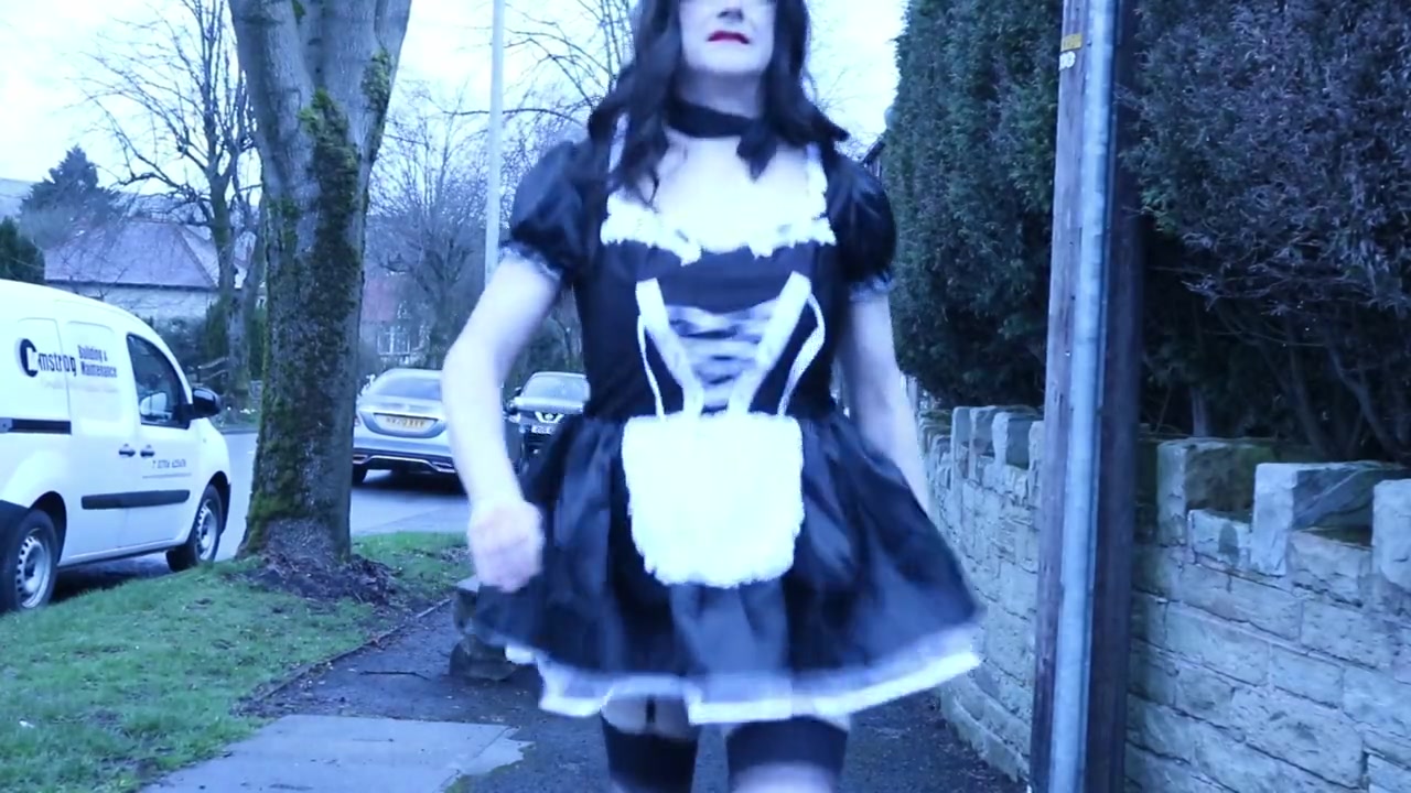 French maid crossdresser outdoors on a council estate