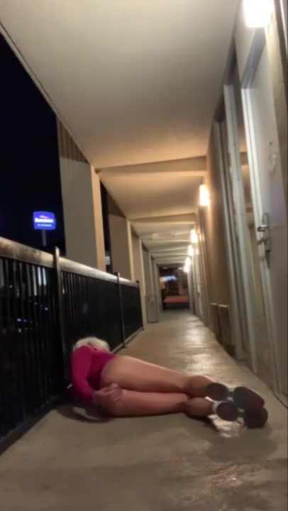 Outside public play, hotel sidewalk, passionate dildo anal, bold public sissy gets carried away on the sidewalk, anybody could come out at any time, and she could get caught. Crazy risky