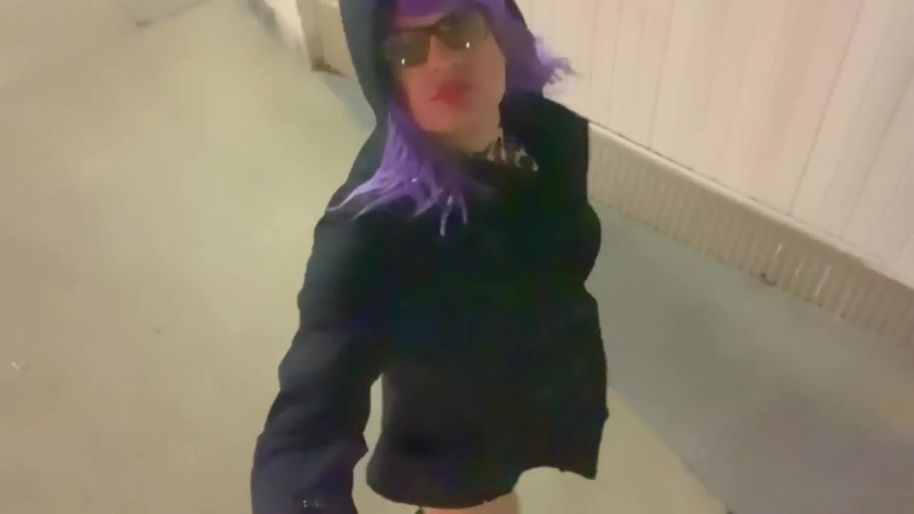 Amazing public slutty sissy display, Cindy love! Sexy purple hair, very risky public nudity, walking all over downtown in panties, posing, ass out cars drive by, guys walk by ask for a smoke