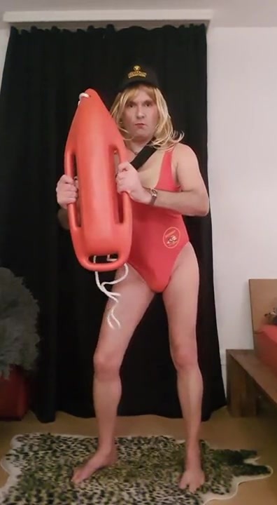 Hornyandrea masturbates in the crimson Baywatch life guard swim suite