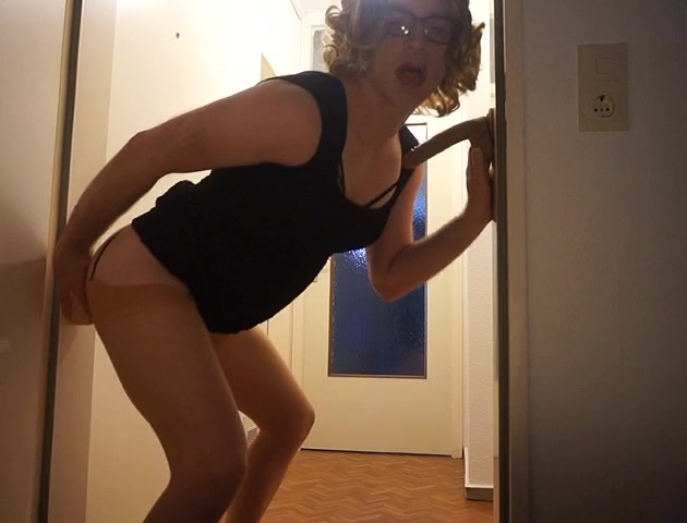 A sexy crossdresser fucks himself with rubber cocks in both holes wearing stockings and a little black dress.