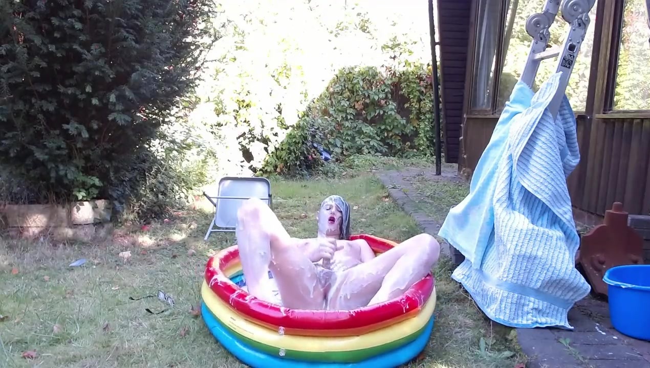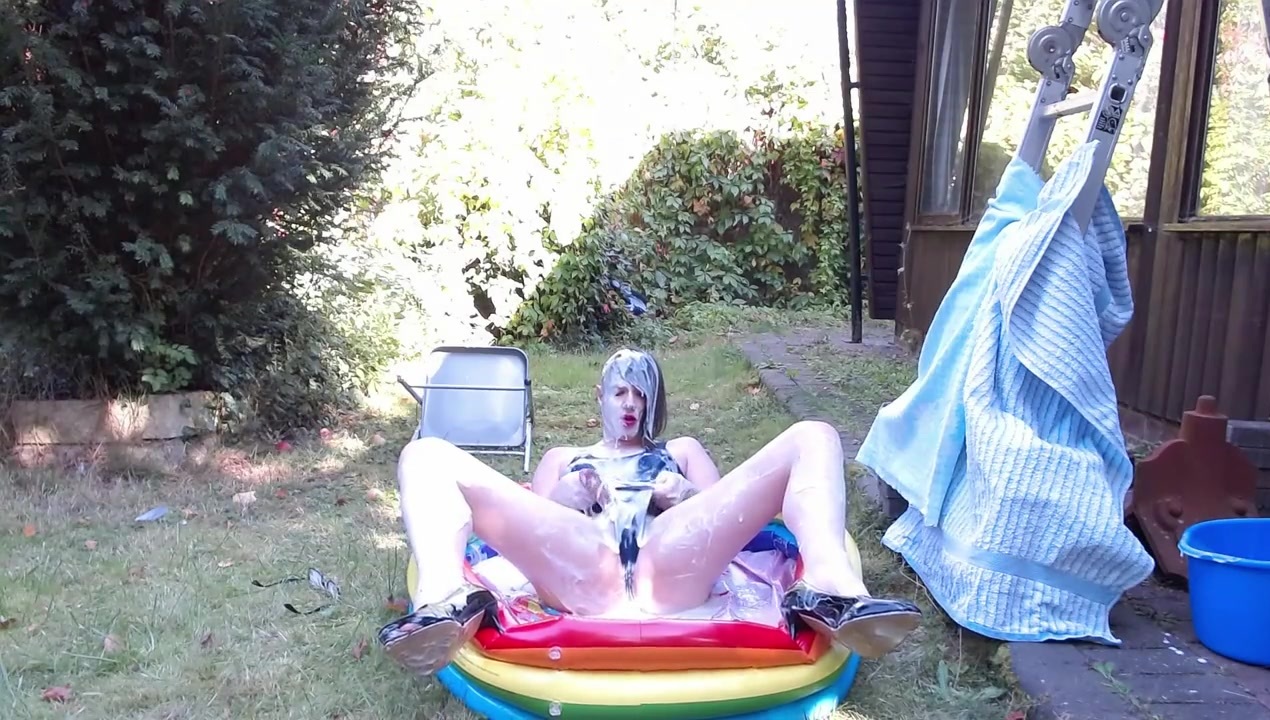 Glamorous sissy in one piece bathing suit gets covered in slimy white gunge, finds herself getting so turned on that she writhes around in the messy slime, playing with herself like a filthy slut.