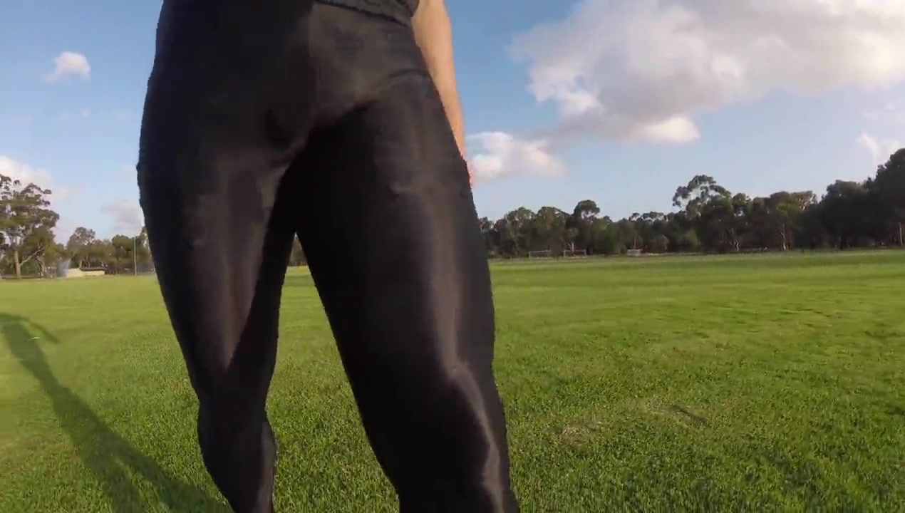 crossdresser on a public street in spandex stretch pants and cool platform roll flops