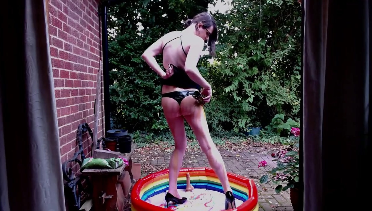 Sissy slut outdoors in black lace mini teddy dress gets all wet and messy covered in extra virgin olive oil and fucked dildo to a long and intense orgasm in a paddling pool while all covered in oil.