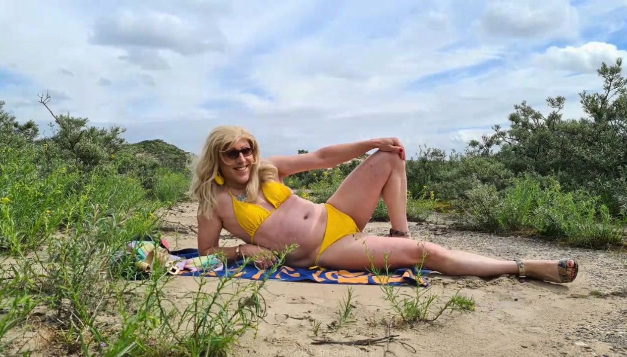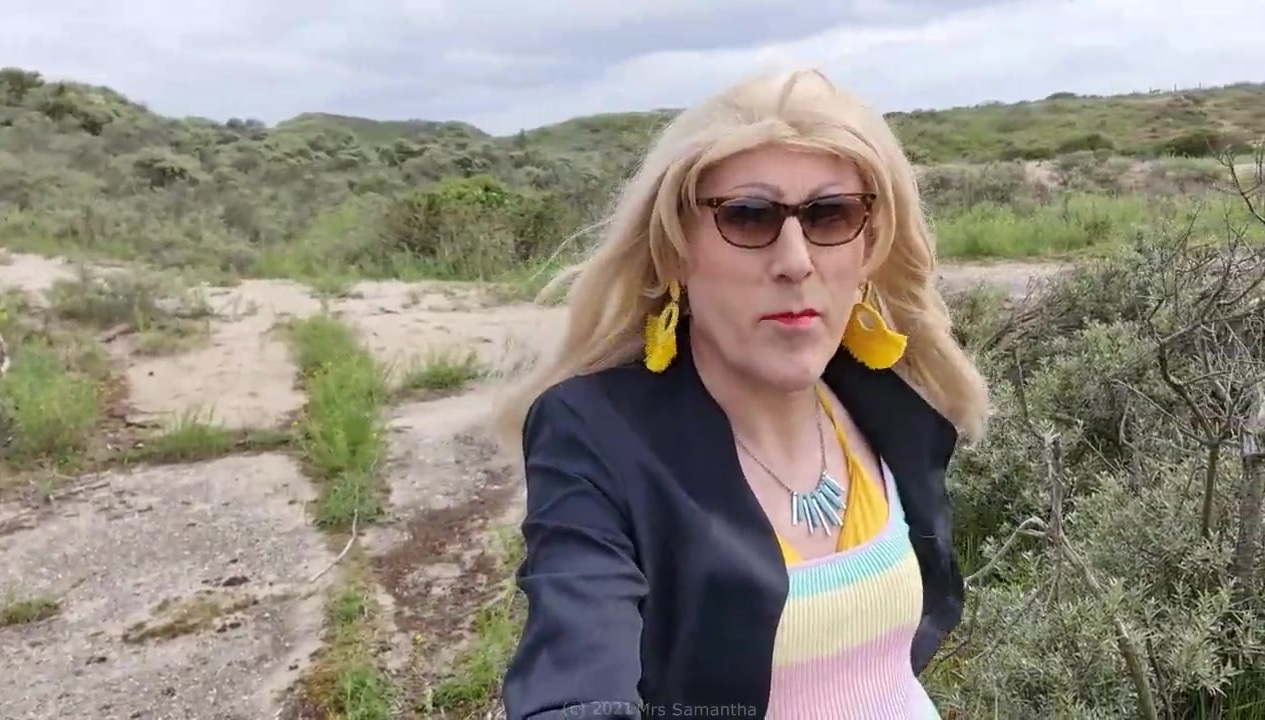 Mrs Samantha going out to the dunes near Langevelder Slag, for a leisurely walk and to find a nice spot for some hot sunbathing, to enhance the nice Bikini tan lines on her lovely small tits