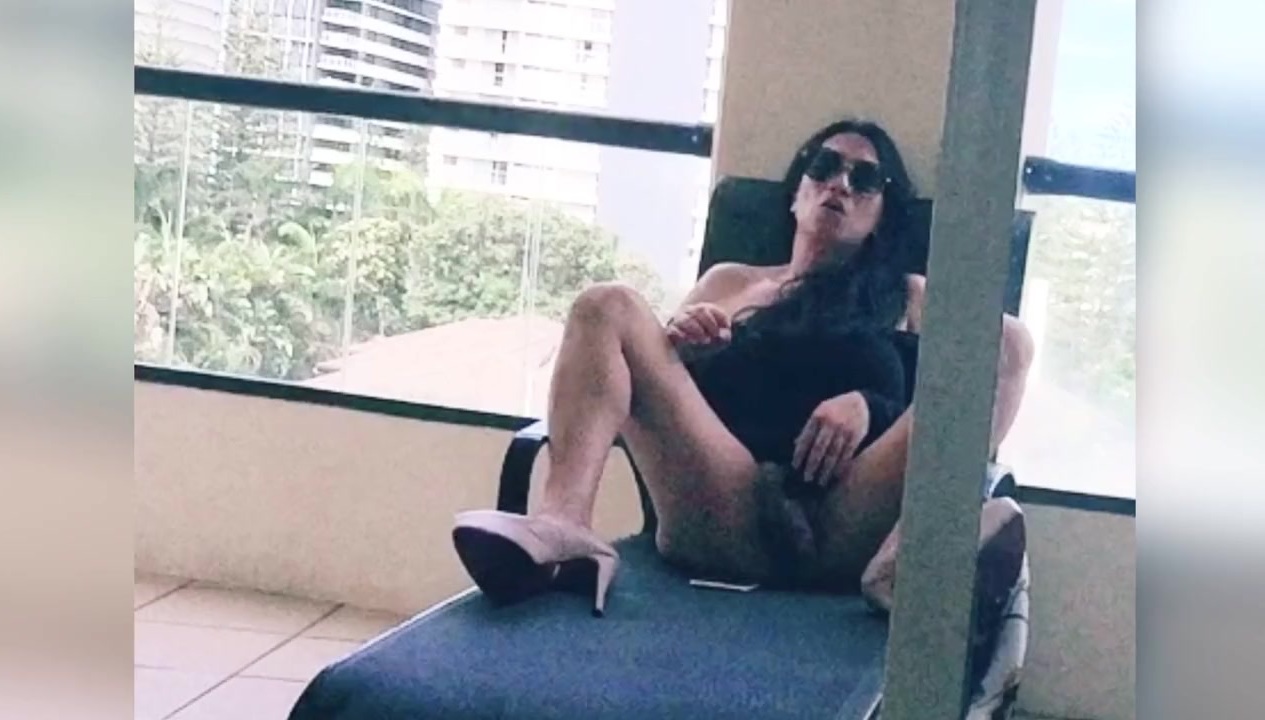 Fabulous CD Tawny displays satin underpants on motel balcony. Part 1