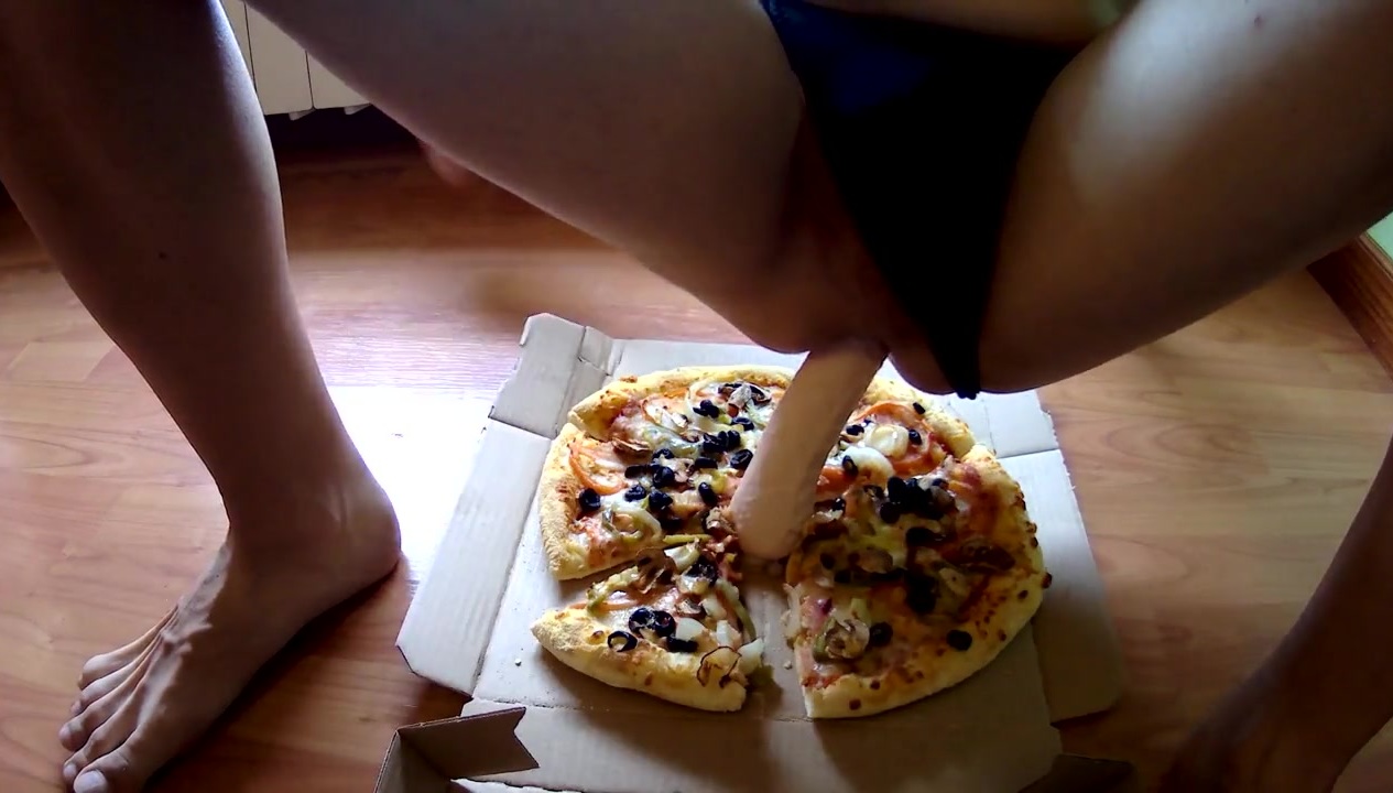 JIZZ FOOD fetish. Taunting, faux-cock and munching pizza with jizz