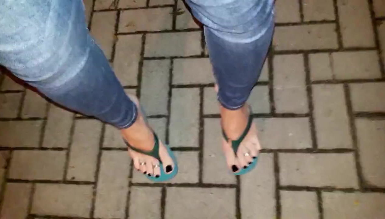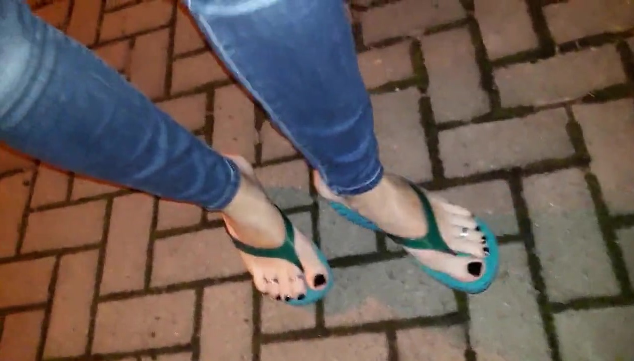 sexy stroll - skinny jeans and bare feet with platform flip flops