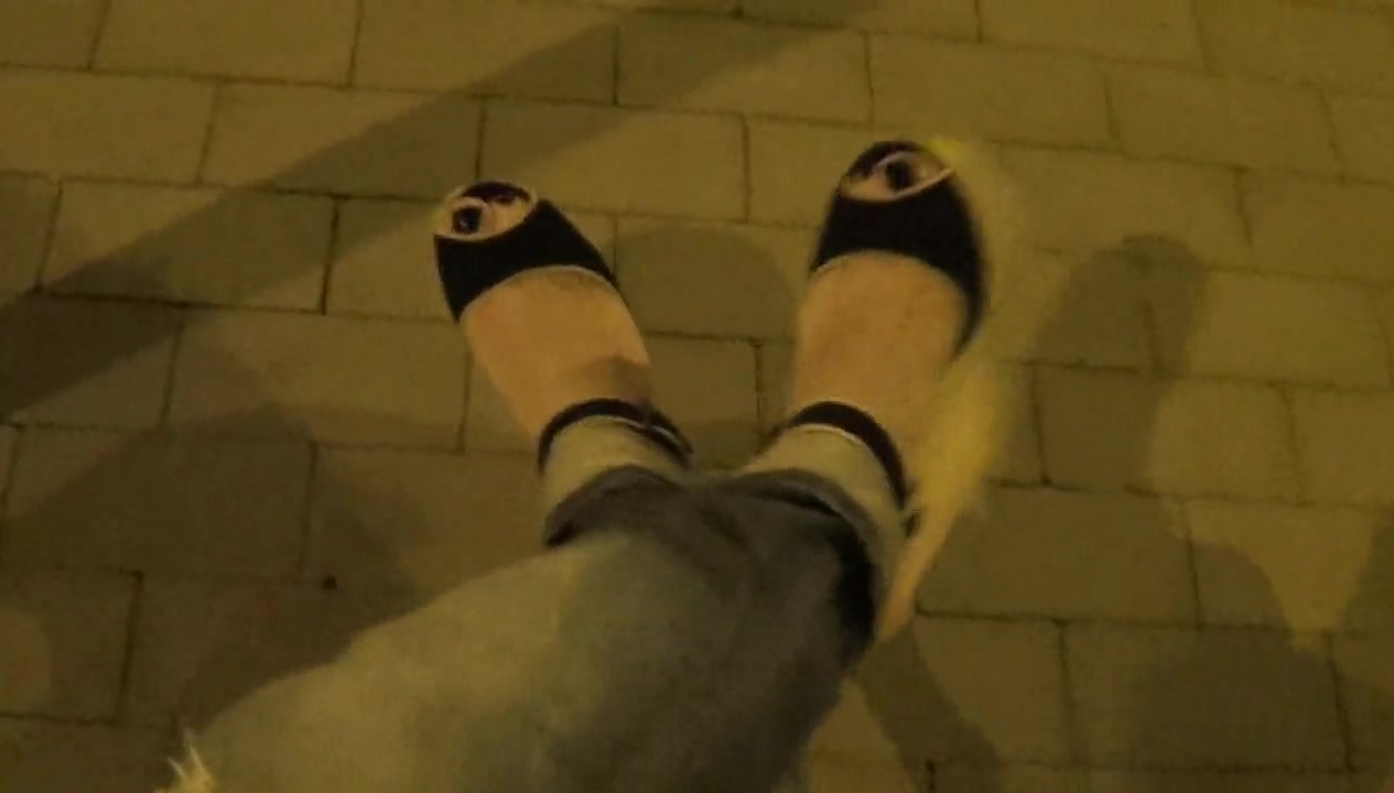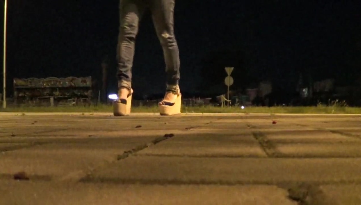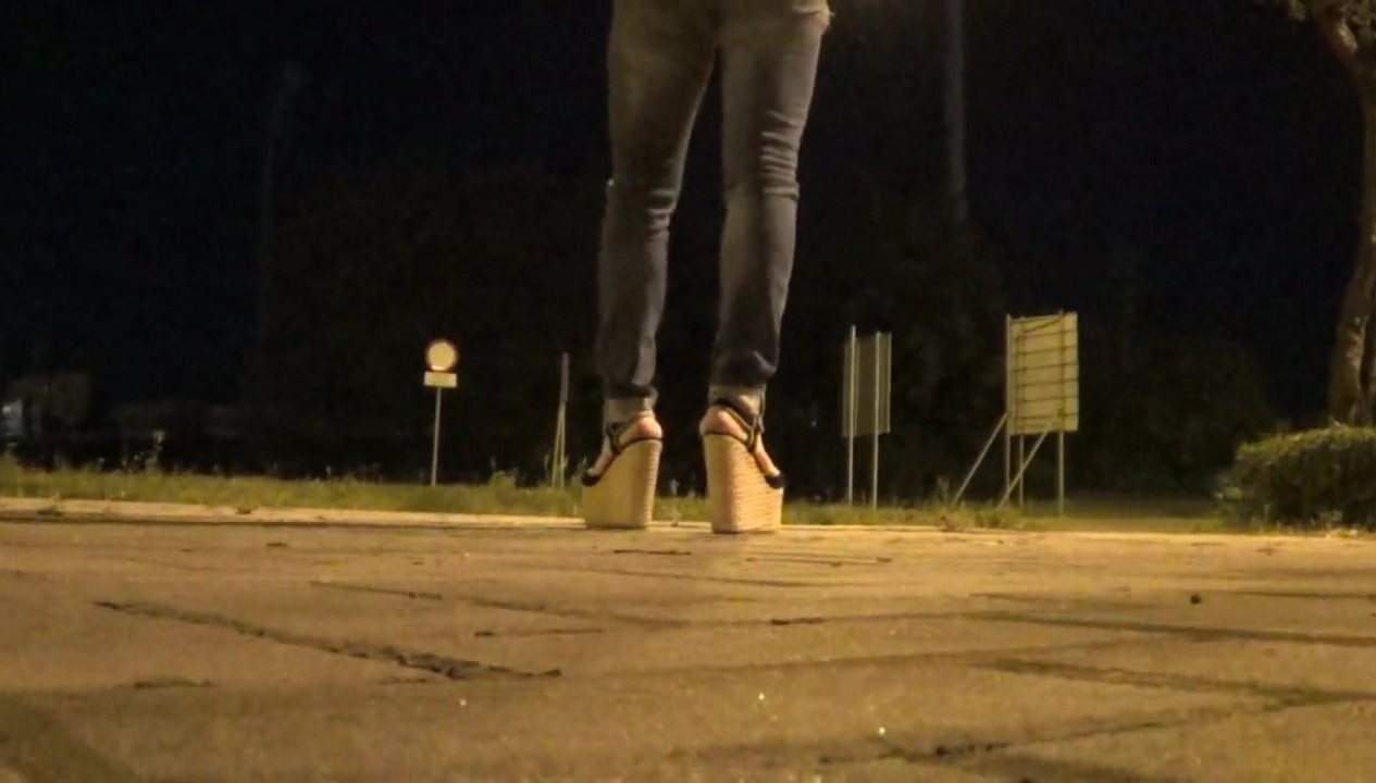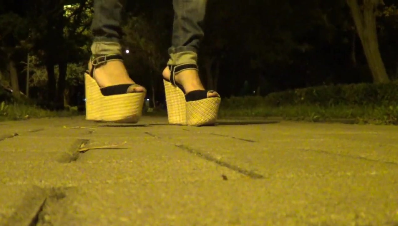 public stroll - walking and teasing - my sexy feet - skinny jeans and very big platform wedges