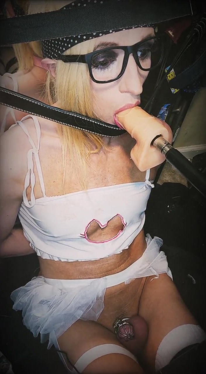 Sissy Mara Jade's would Head is restrained Up against A Mirror While A Dildo Machine Fucks her Helpless Throat