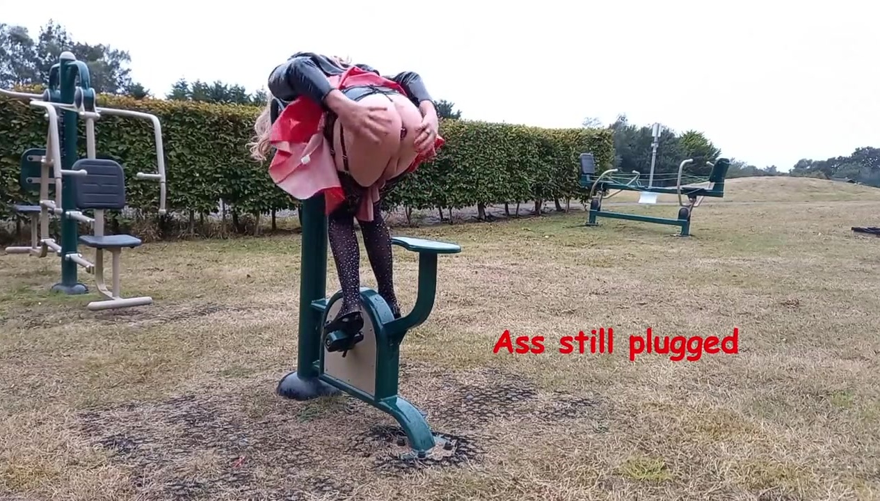 Tgirl in PVC having fun using the exercise equipment in the park.
