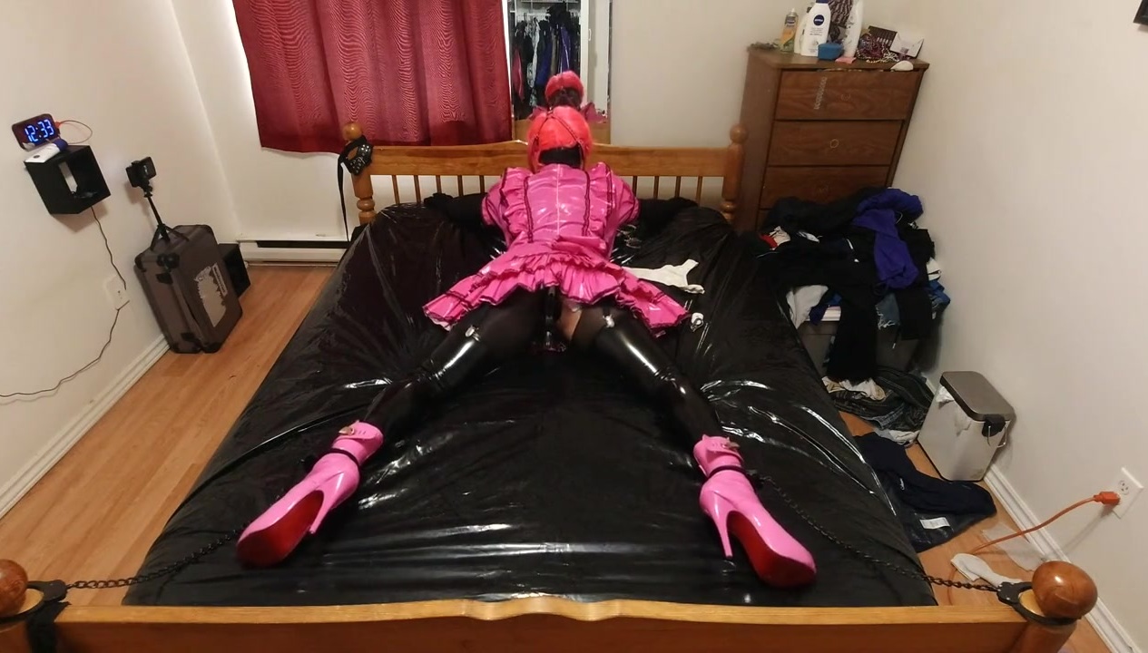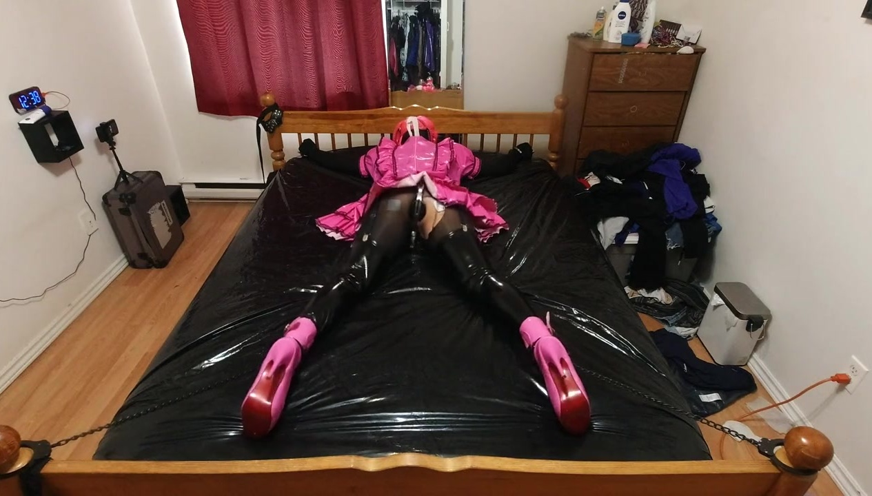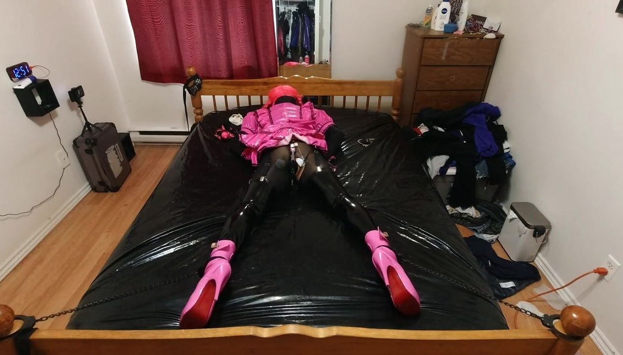 cuffed spread to bed in chastity and Estim on the bum cheeks..
