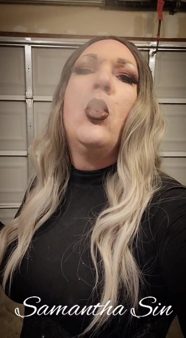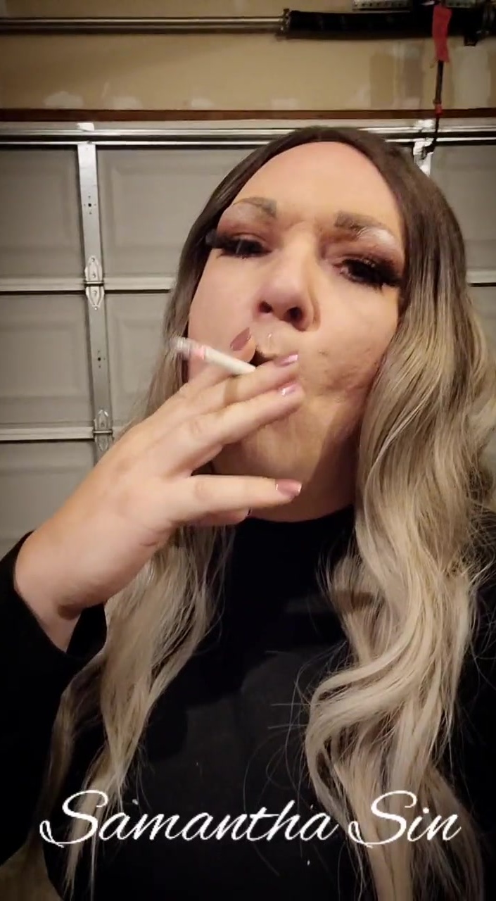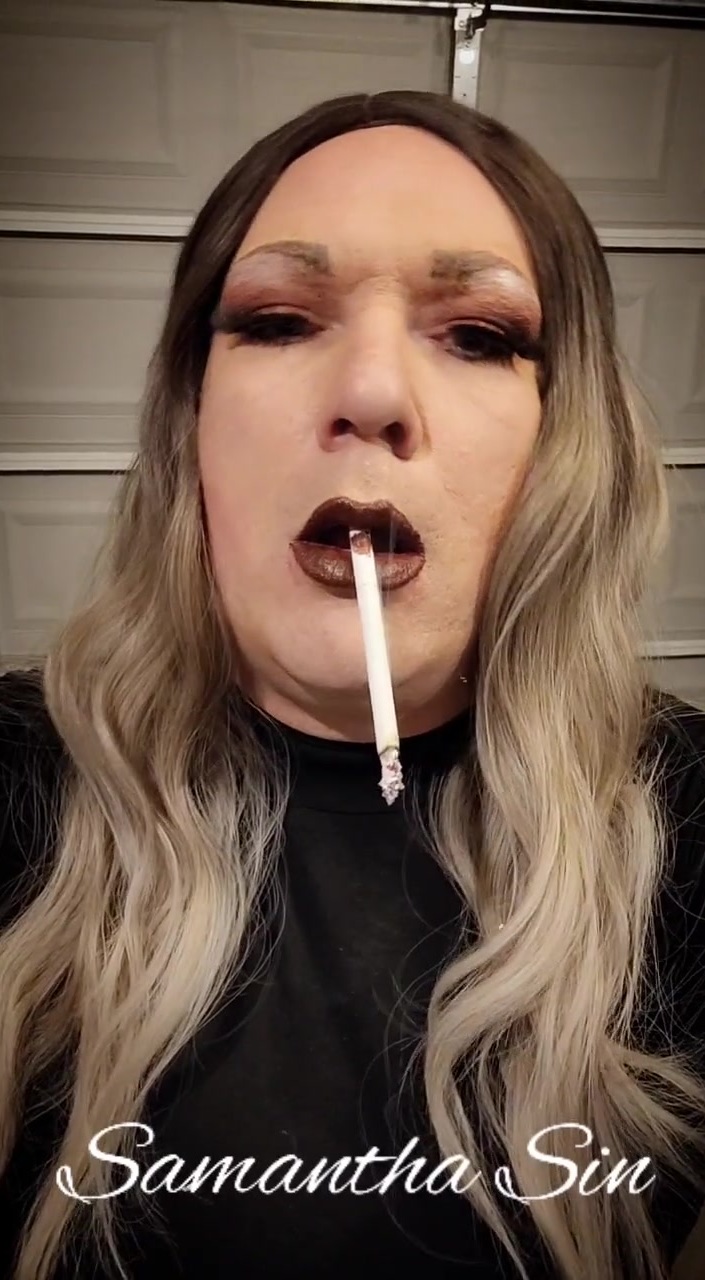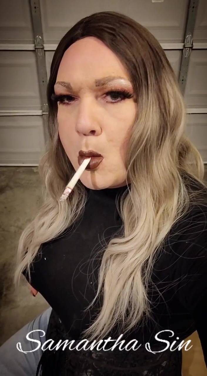 Samantha Sin CD smoking a Virginia Slims 120 cigarette. Dangling, pvc vinyl dress, lipstick, crossdresser, fetish, tranny, blonde, heavy makeup, shemale