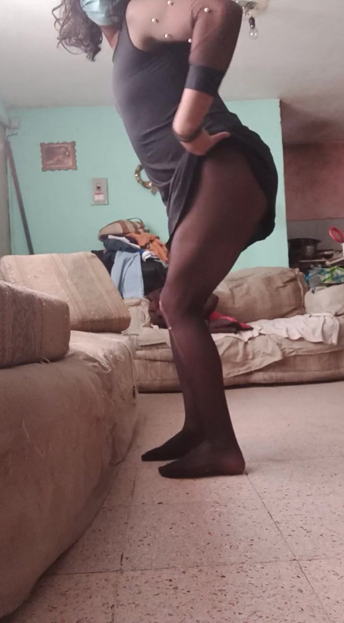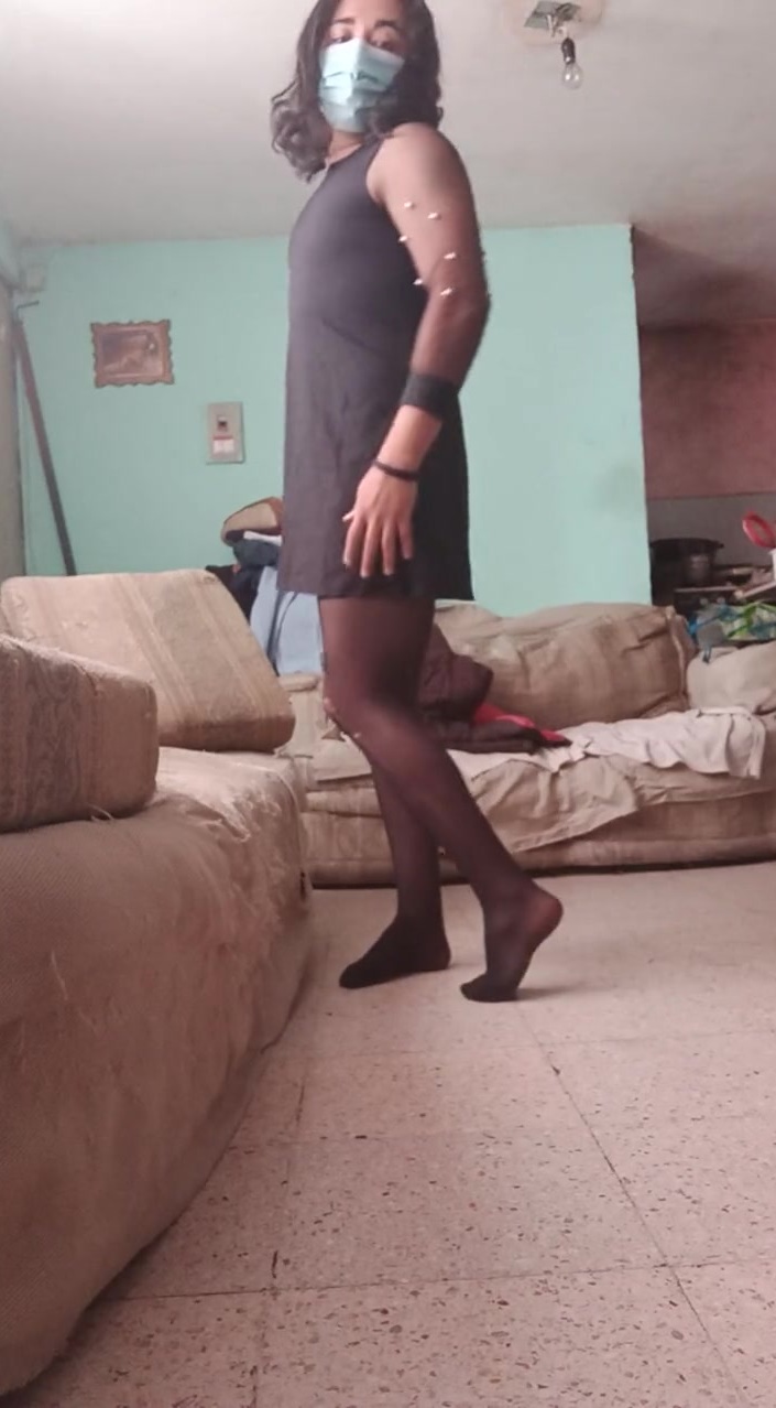 Sissy femboy masturbates in brief black sundress