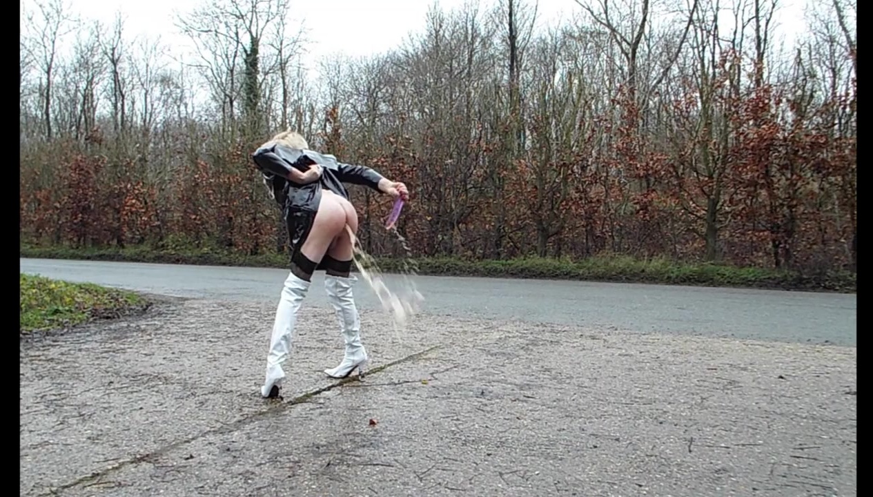 Tranny Gina Trent outdoors and squirting more milk from her ass, with some pissing too