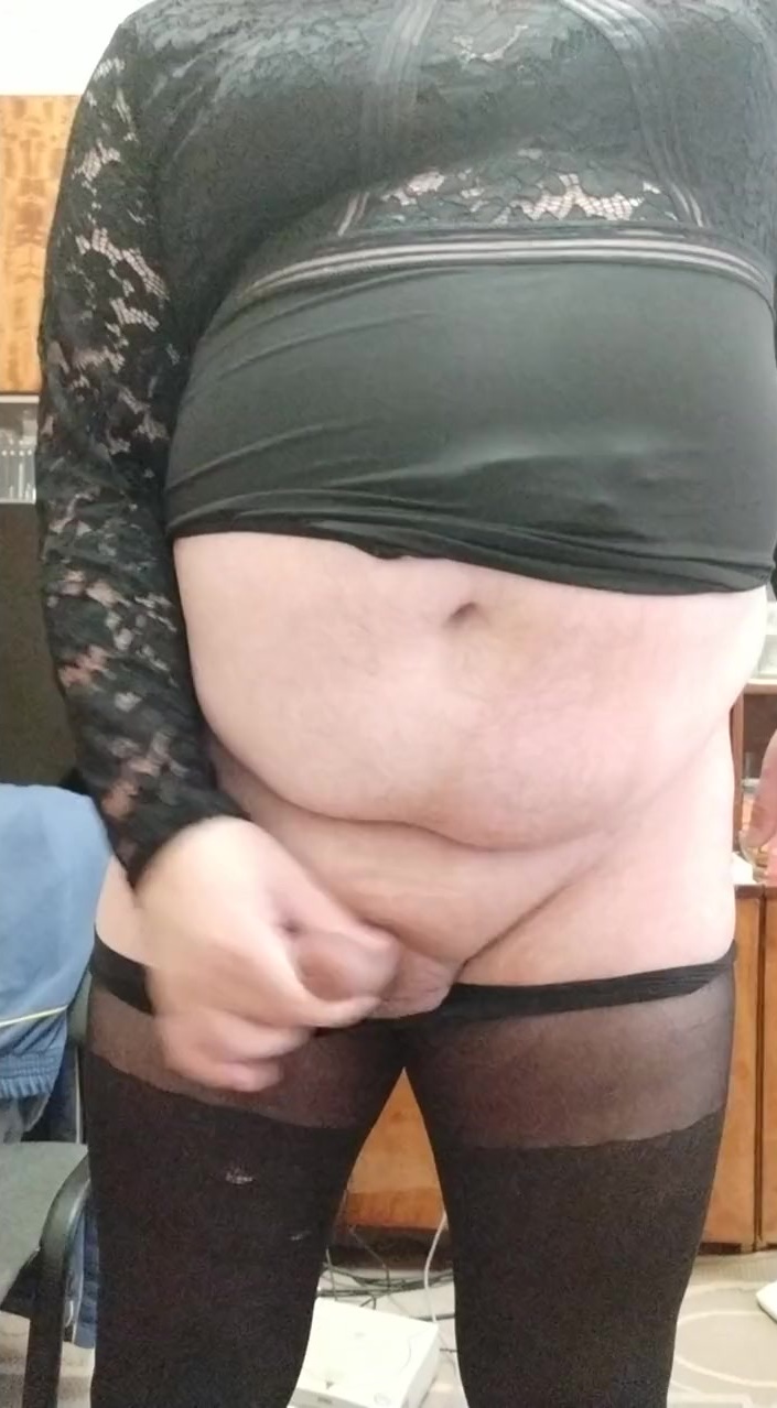 Black-Haired t-girl in black sundress unsheathes her puny spunk-pump and fur cover...