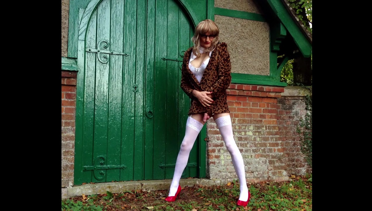 Transgirl Gina Trent Outdoors in vinyl peeing and posing