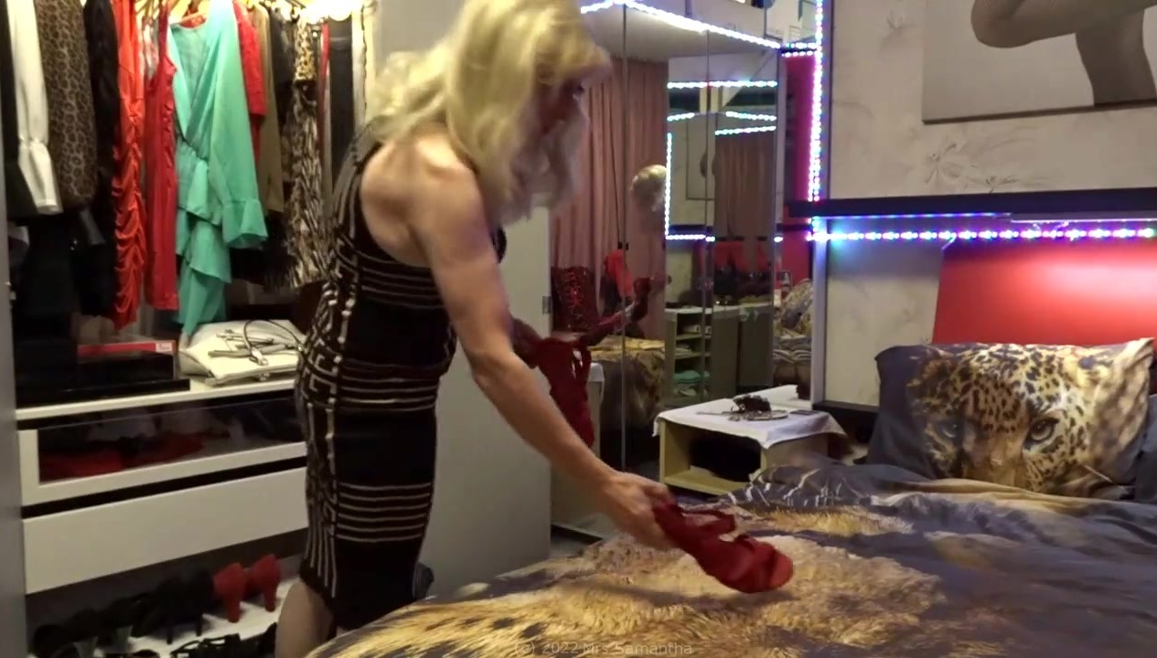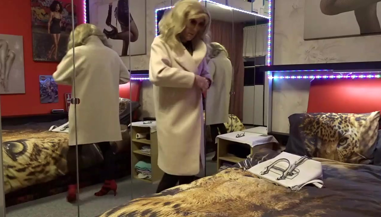 Mrs Samantha is dressing up for a casual outing, showing some of her makeup, shoes and outfit. Selecting a pair of red high heel sandals, black stockings, a tight dress and a stylish coat and purse.