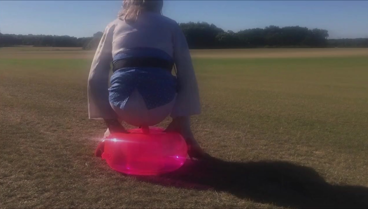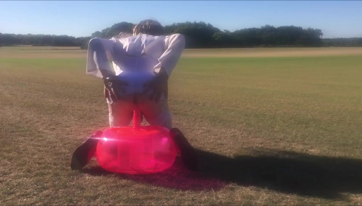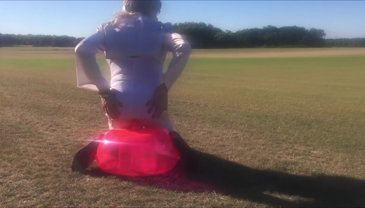 UK Tranny Gina Trent takes her dildo cushion for a workout in the farmers field