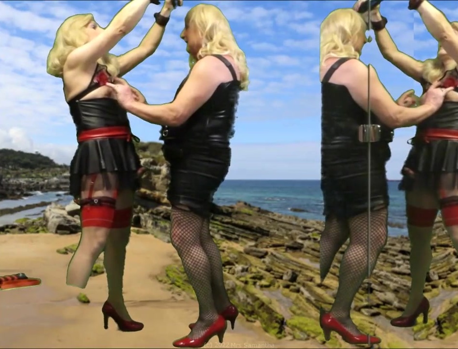Marina, this time in a role as Mrs, has her bitch Samantha chained up to the ceiling and pampers her with nipple-play the teases with vibrators on her clit and nipple, with a good blow-job in between!