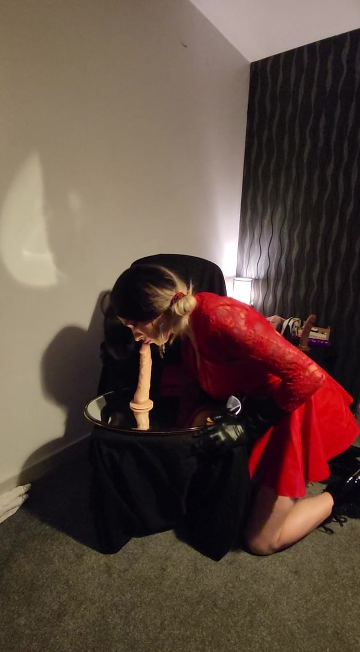 Cindy has fun in little red dress while caged in chastity training her throat for daddy