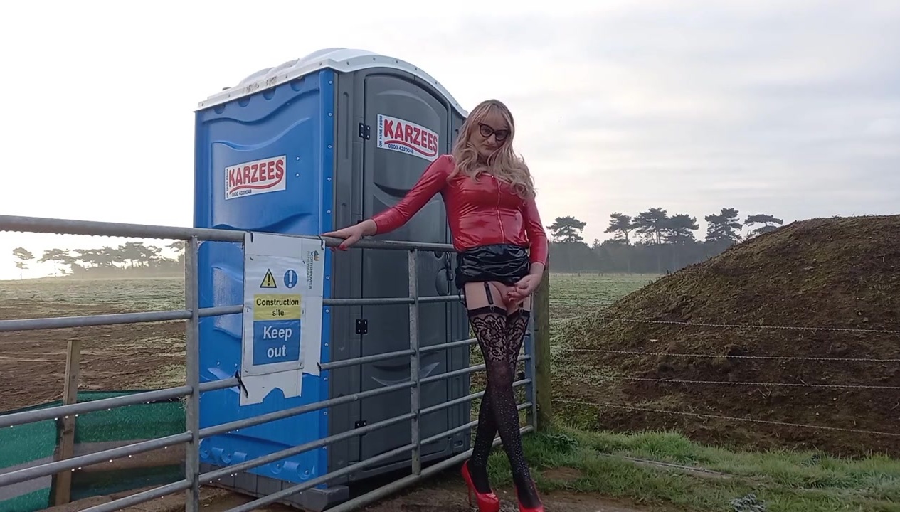 Crossdressing tranny slut outdoors in red and black PVC posing, wanking and pissing for the randy photographer
