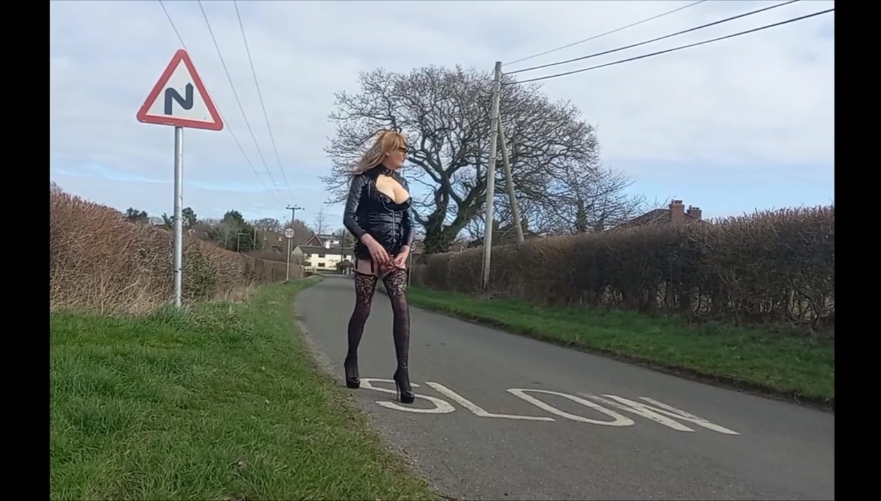 UK tranny slut dressed up in pvc and taking a piss while posing outdoors