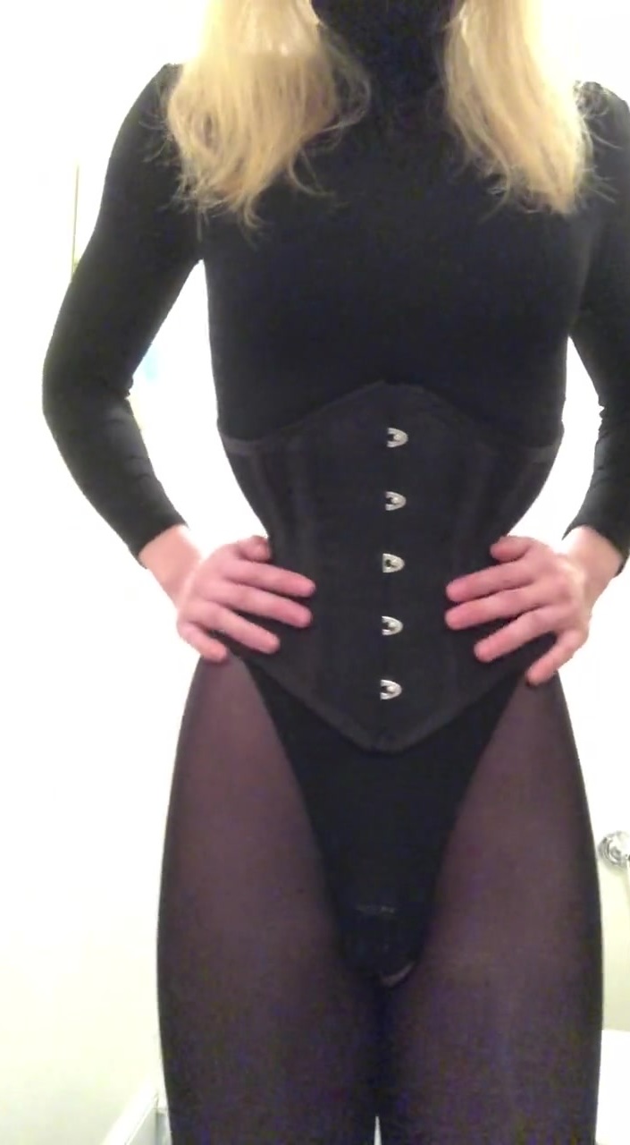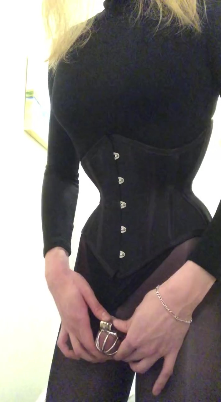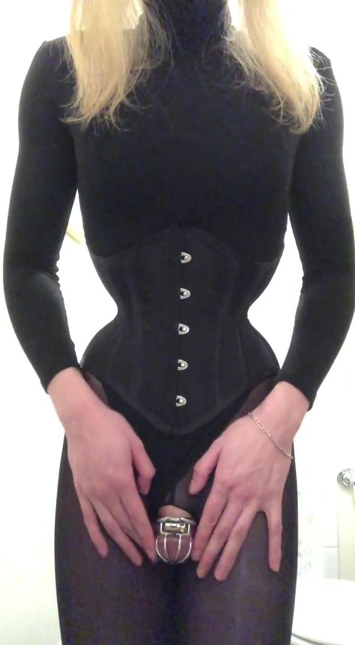 I'm dressed up in a sexy black outfit - bodysuit, sheer pantyhose, and a tightly laced corset. Feeling my curves, I become very horny, and I desperately try to cum while locked in a chastity cage.
