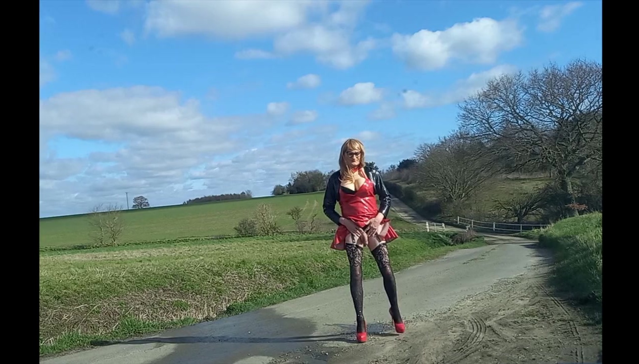 Crossdressing tranny slut Gina outdoors wearing pvc pissing, squirting milk, wanking and cumming