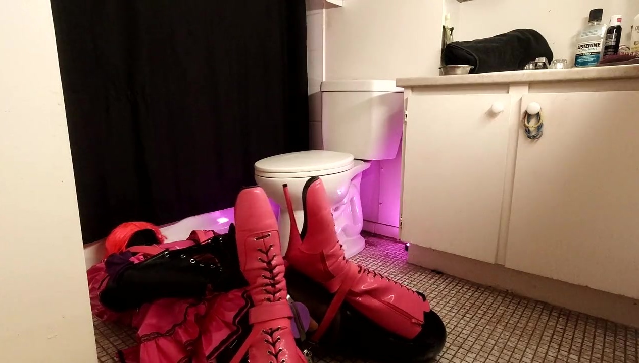 with chastity belt locked on holding my favorite dildo in place, gagged, ankles strapped to thighs wearing ballet boots and my armbinder pulled way up extra snug... no numbing cream this time..