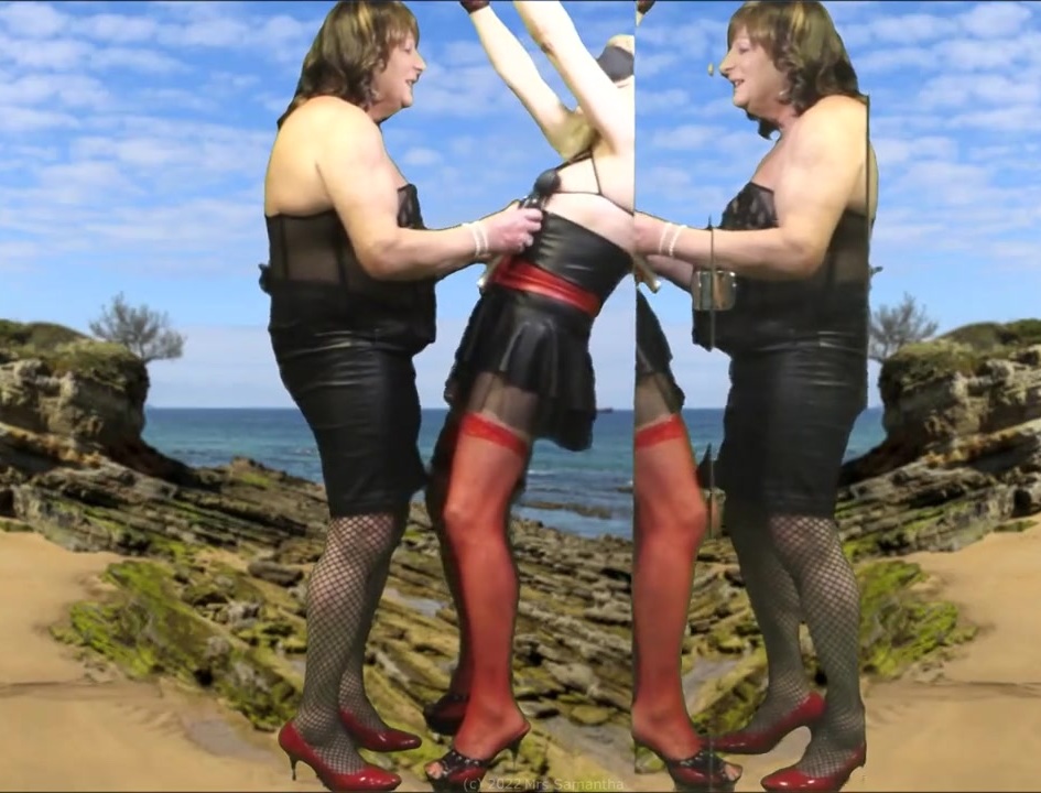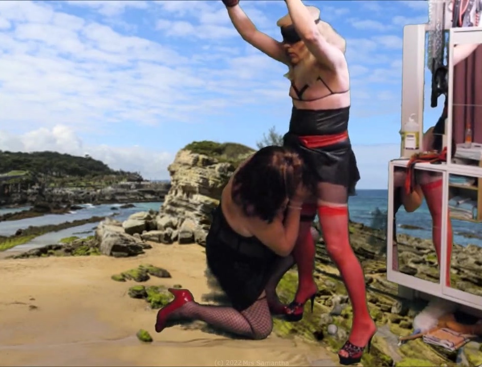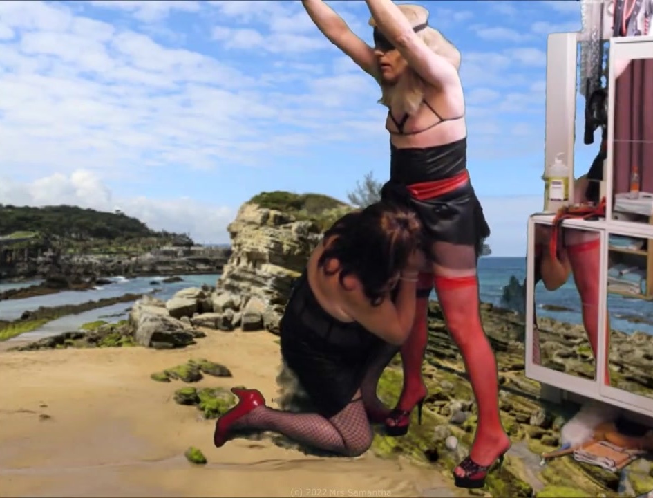 Marina, in a rare role as dominatrix, dominating her own Mrs Samantha by chaining her up, teasing and rewarding her with some good nipple play and a blowjob