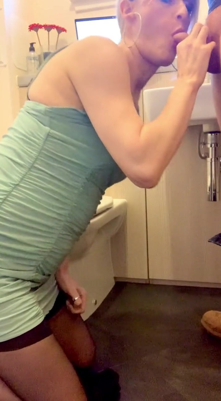 Dirty trans slut sucks on a lovely hung hard cock, lots of deepthroat action and taking a juicy cum load over her face! Dressed in a mini dress, suspender belt & stockings!