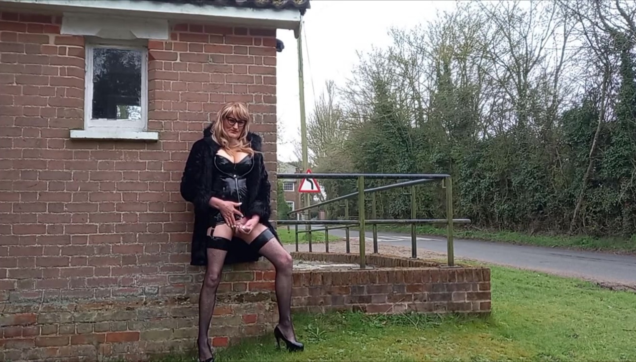 Tranny shemale slut Gina outdoors wearing black pvc, stockings, high heels squirting and wanking