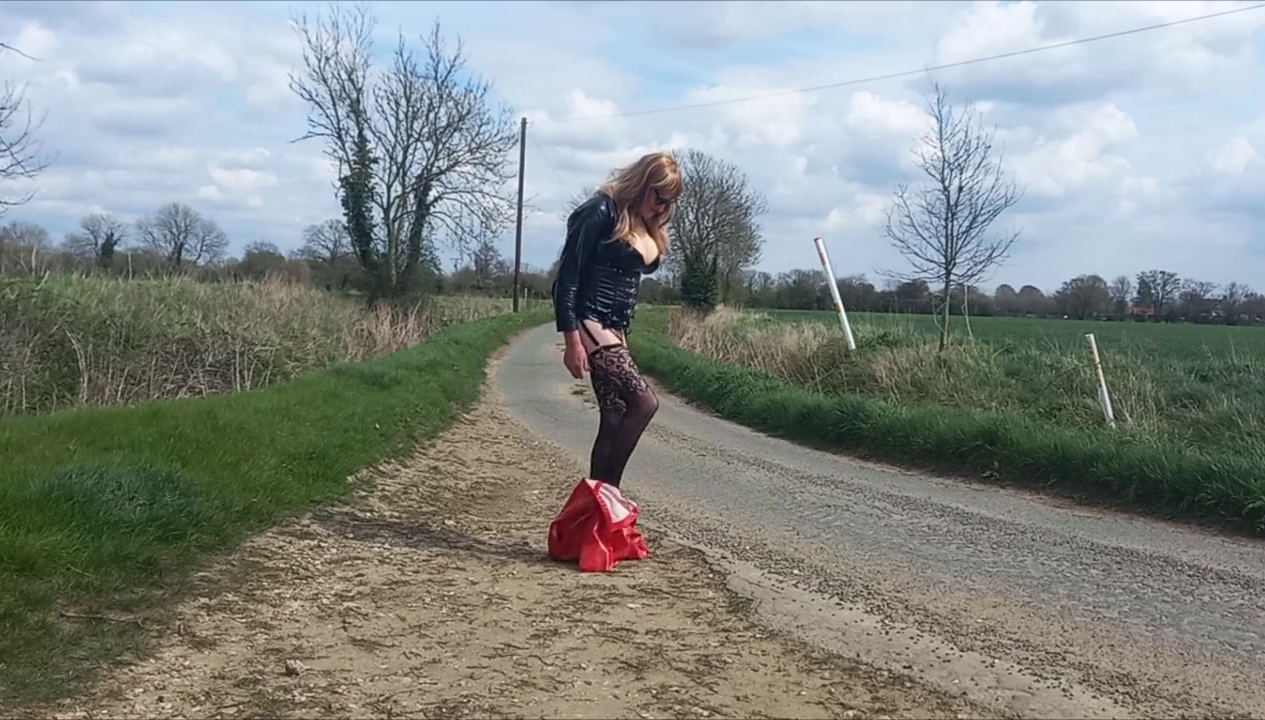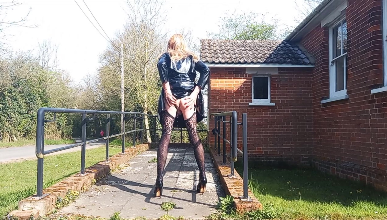 Crossdressing tranny slut outdoors and squirting milk from her ass