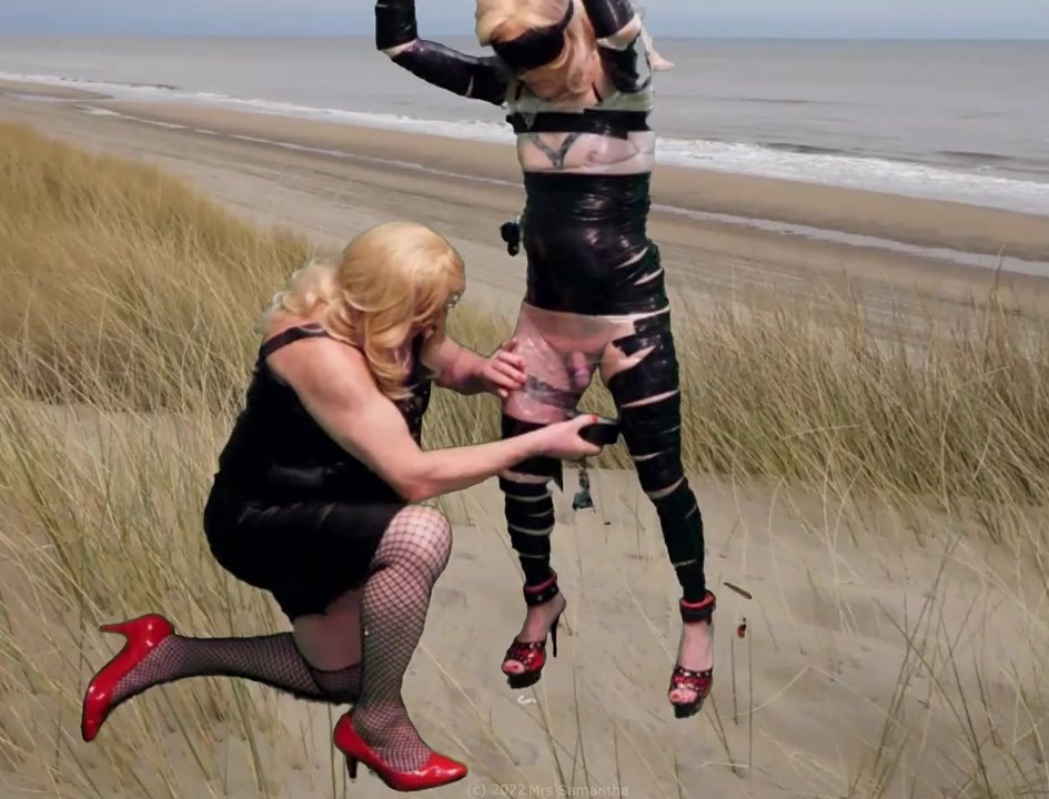Marina in a dominating role, turns her slave Tgirl Samantha into a living sex-doll by wrapping her in plastic and taping with black duct tape. All in preparation for a tease and fuck session!