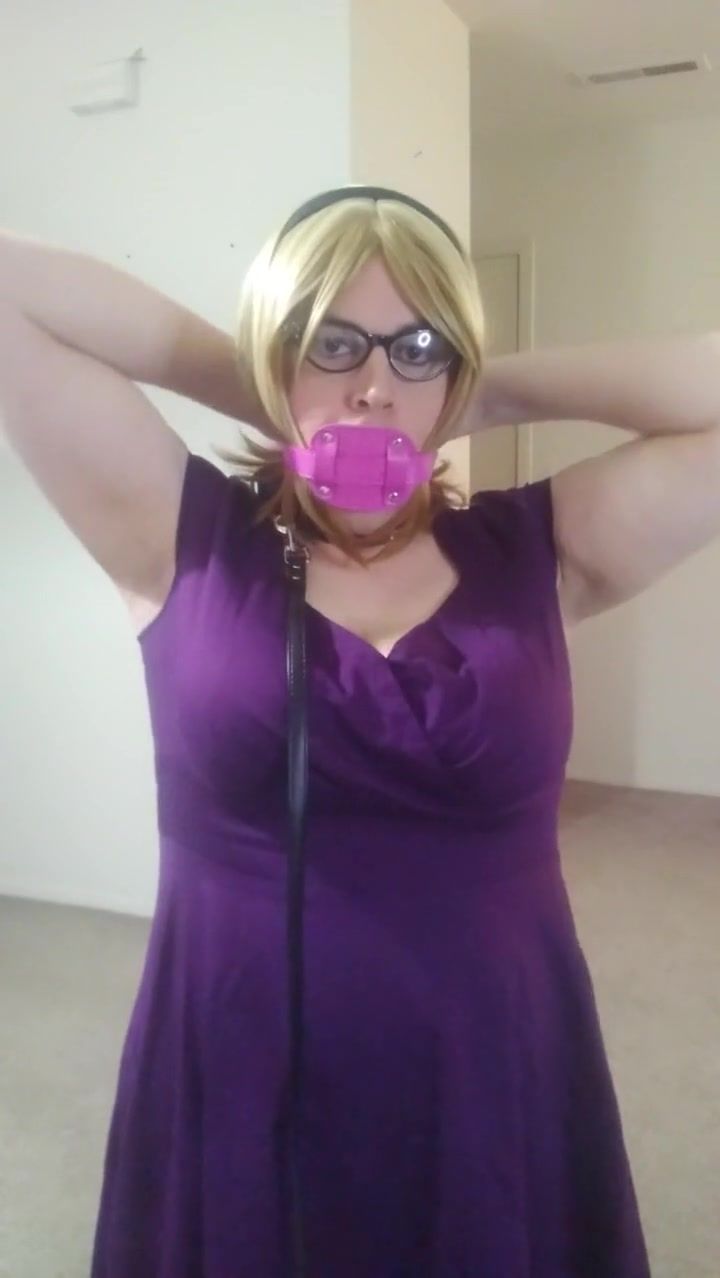 Sissy showing off some new bondage gear. Collar, cuffs, chastity, heels and a penis gag....everything is locked on! What would you do, if you had this sissy's keys? How else should she be tied up?
