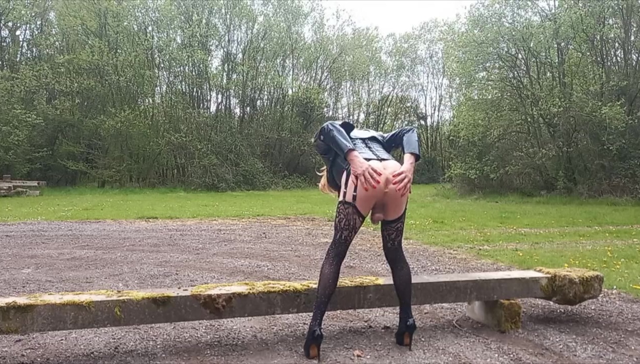 Crossdressing tranny outdoors milk enema and squirting from her ass