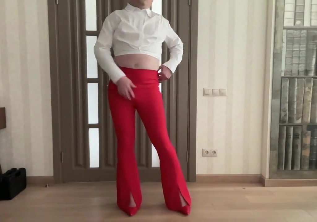 Flared crimson pants and white whip half-shirt on t-model crossdresser femboy sissy prepped for assistant job and college soiree