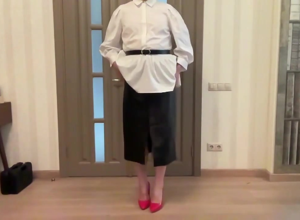Look at my ass in leather pencil black skirt and white shirt oversize blouse. I wear my new clothes today to suck cocks in office and eat cum of my friends. I'm so horny tranny, your best cum sucker